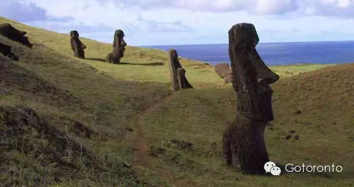 ▼在復活節島上目前有887座摩艾石像,都座落在不同的地方。
