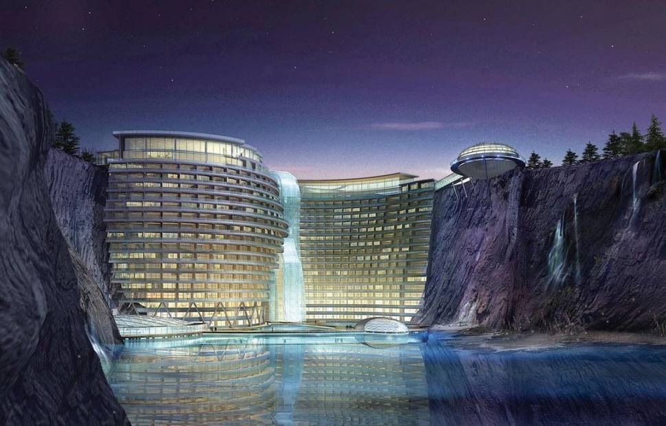 世界首个深坑酒店——上海佘山深坑酒店,其坑下16层悬壁式空中酒店被誉世界性建筑奇迹。在佘山脚下负80米深坑建造世界唯一的五星级深坑酒店