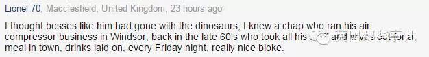 “像这要的好老板估计已经跟恐龙一起灭绝了吧。我60年代的时候认识一个哥们每周五晚上都带着所有员工,以及员工家属一起进程吃喝狂欢。现在再也没有这要的好事儿了。”
