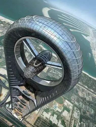 这座大楼外观看起来像是一个超大规模的风力涡轮,其实中见椭圆形的部分是一间餐厅,其他部分分别是住宅、办公室、酒店、画廊等等。