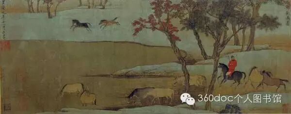 此图绘初秋郊原,牧人在荒野溪涧牧马的情景。水面平缓无波,岸边林木环绕,油油绿草衬以秋树红叶,环境幽雅美丽。一乌衣红帽奚官正策马而来,其前后十几匹马肥硕健壮,姿态各异,生动活泼。画面设色古雅,构图饱满,均衡有致,风格古朴厚重。