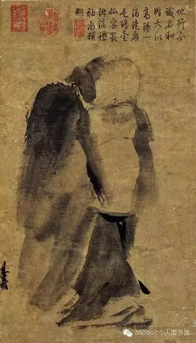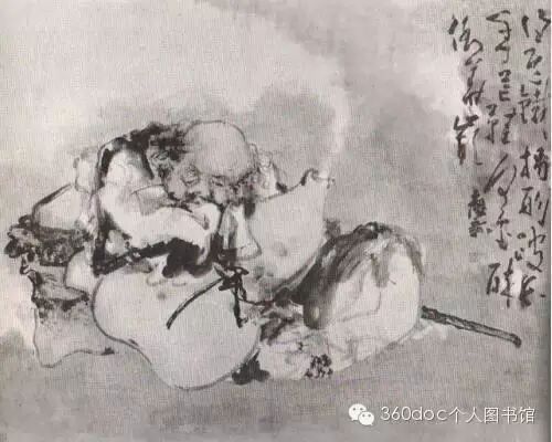 此画画的是八仙之首铁拐李醉眠情状。相传铁拐李学道于太上老君,神游时被其徒误焚其肉身,魂无所依,遂附一饿死者之尸,因此蓬首垢面,秃顶跛足,状貌其丑。遂拄铁杖,背葫芦,云游天下,济世度人,神通异常。