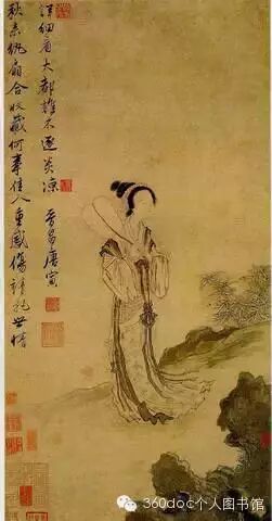 秋风纨扇图为唐寅水墨人物画代表作,画一立有湖石的庭院,一仕女手执纨扇,侧身凝望,眉宇间微露幽怨怅惘神色。她的衣裙在萧瑟秋风中飘动,身旁衬双勾丛竹。此图用白描画法,笔墨流动爽利,转折方劲,线条起伏顿挫,把李公麟的行云流水描和颜辉的折芦描结合起来,用笔富韵律感。全画虽纯用水墨,却能在粗细,浓淡变化中显示丰富的色调。画左上部题诗:“秋来纨扇合收藏,何事佳人重感伤,请把世情详细看,大都谁不逐炎凉。”借汉成帝妃子班婕妤色衰恩弛,好比纨扇在秋风起后被搁弃的命运,抨击了世态的炎凉。显然,这是与唐寅个人生活的不幸遭遇有关的。画中女子一脸衰怨,或许正是唐寅自身的写照。