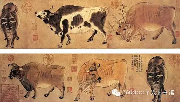 《五牛图》麻纸本,纵20.8厘米,横139.8厘米,无作者款印,有赵构、赵孟頫、孙弘、项元汴、弘历、金农等十四家题记。画中五头不同形态的牛,韩滉以淳朴的画风和精湛的艺术技巧,表现了唐代画牛所达到的最高水平,被称为“中国十大传世名画”之一。