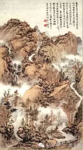 本图无款,以立幅构图画重重叠起的山峦,下部清澈的溪水,曲折的小路通向山中,山坳处茅舍数间,屋中有二人对坐,境界清幽,前人谓巨然之山水,善为烟岚气象,“于峰峦岭窦之外,至林麓之间,犹作卵石、松柏、疏筠、蔓草之类,相与映发,而幽溪细路、屈曲萦带、竹篱茅舍、断桥危栈,真若山间景趣也”。