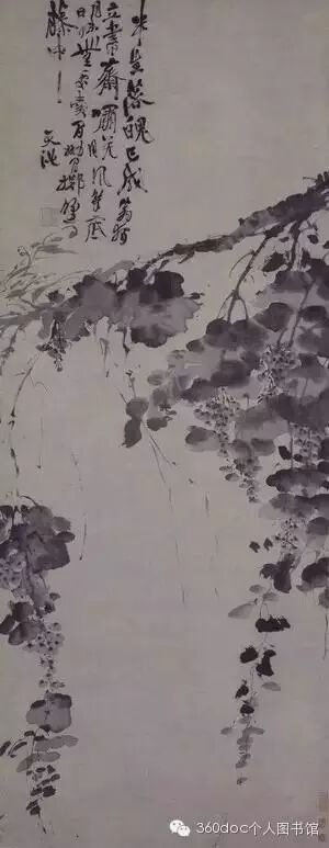 水墨葡萄一枝,串串果实倒挂枝头,水鲜嫩欲滴,形象生动。茂盛的叶子以大块水墨点成。风格疏放,不法语形似,代表了徐渭大写意花卉的风格,也是明代写意花卉高水平的杰作。自题:“半生落魄已成翁,独立书斋啸晚风;笔底明珠无处卖,闲抛闲掷野藤中。天池。”下钤“湘管齐”朱文方印一,尚有清陈希濂、李佐贤等鉴藏印多方。