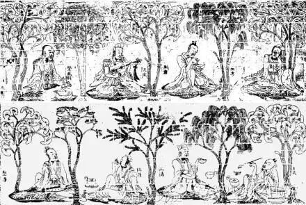 《竹林七贤与荣启期》模印砖画由200 多块古墓砖组成,分为两幅,嵇康、阮籍、山涛、王戎4人占一幅,向秀、刘伶、阮咸、荣启期4 人占一幅。人物之间以银杏、松槐、垂柳相隔。8 人均席地而坐,但各呈现出一种最能体现个性的姿态,士族知识分子自由清高的理想人格在这块画像砖上得到了充分地表现。