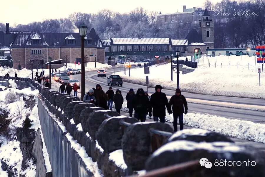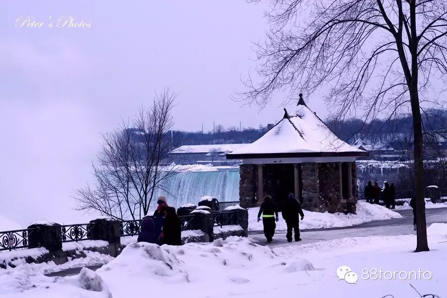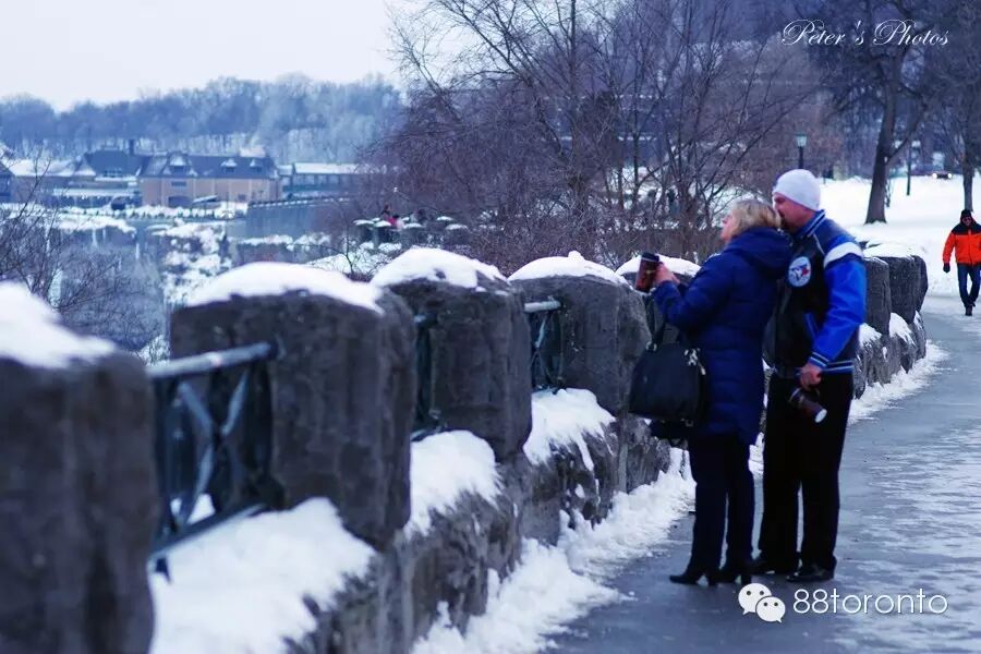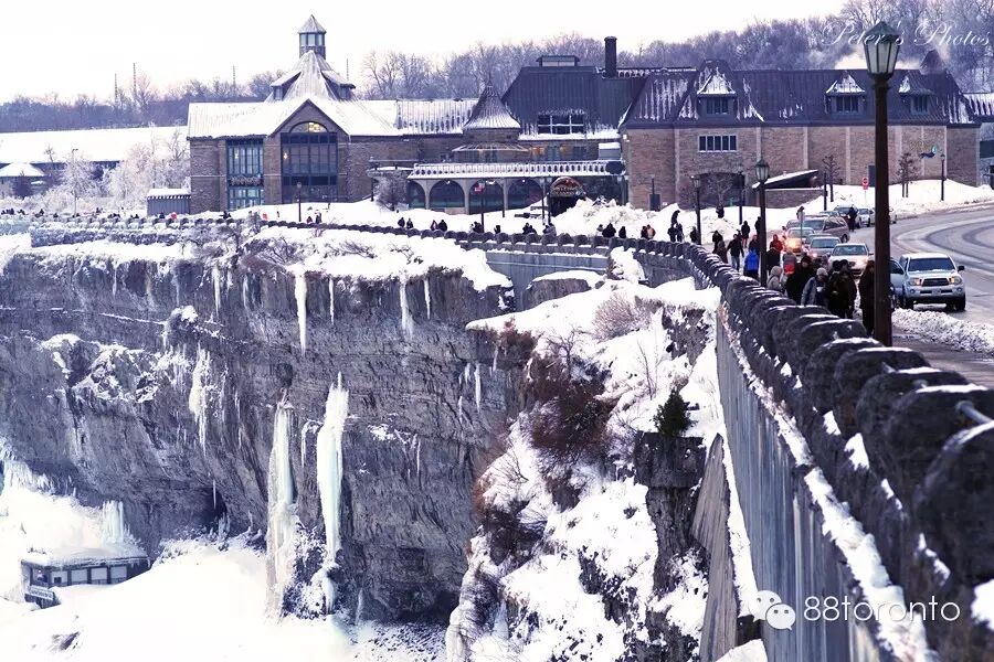昨天下午,本人和几位朋友驱车两个小时左右,冒着严寒赶到位于加拿大这一边的尼亚加拉大瀑布小镇。远远望过去,美国那一边的大瀑布,平日里飞流直下三千尺,此时却被严寒凝固,化作一块块体积庞大的冰雪巨石。