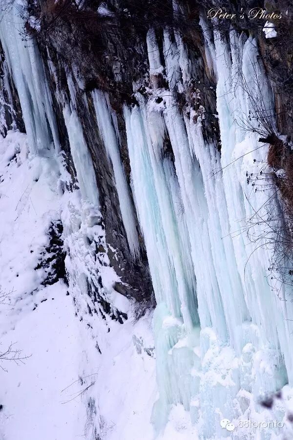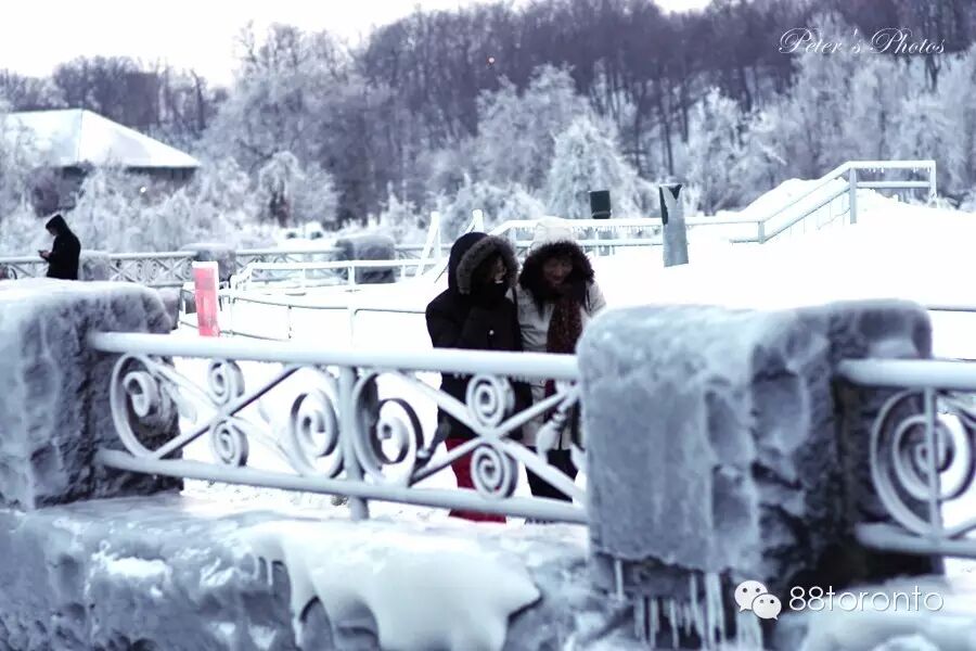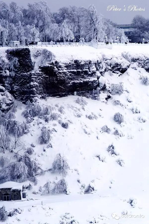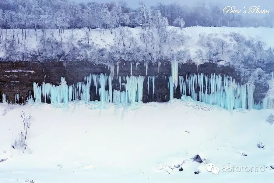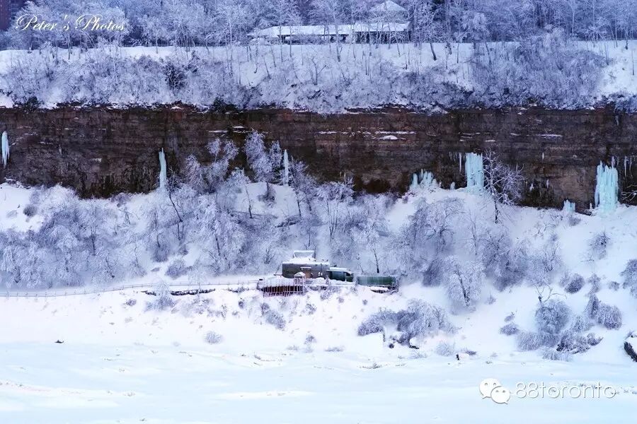 虽然天气阴沉,依然可看到对面美国的水牛城Buffalo玉树琼枝,银装素裹;而加拿大这边游人脚下的悬崖峭壁,已是悬挂百丈冰。