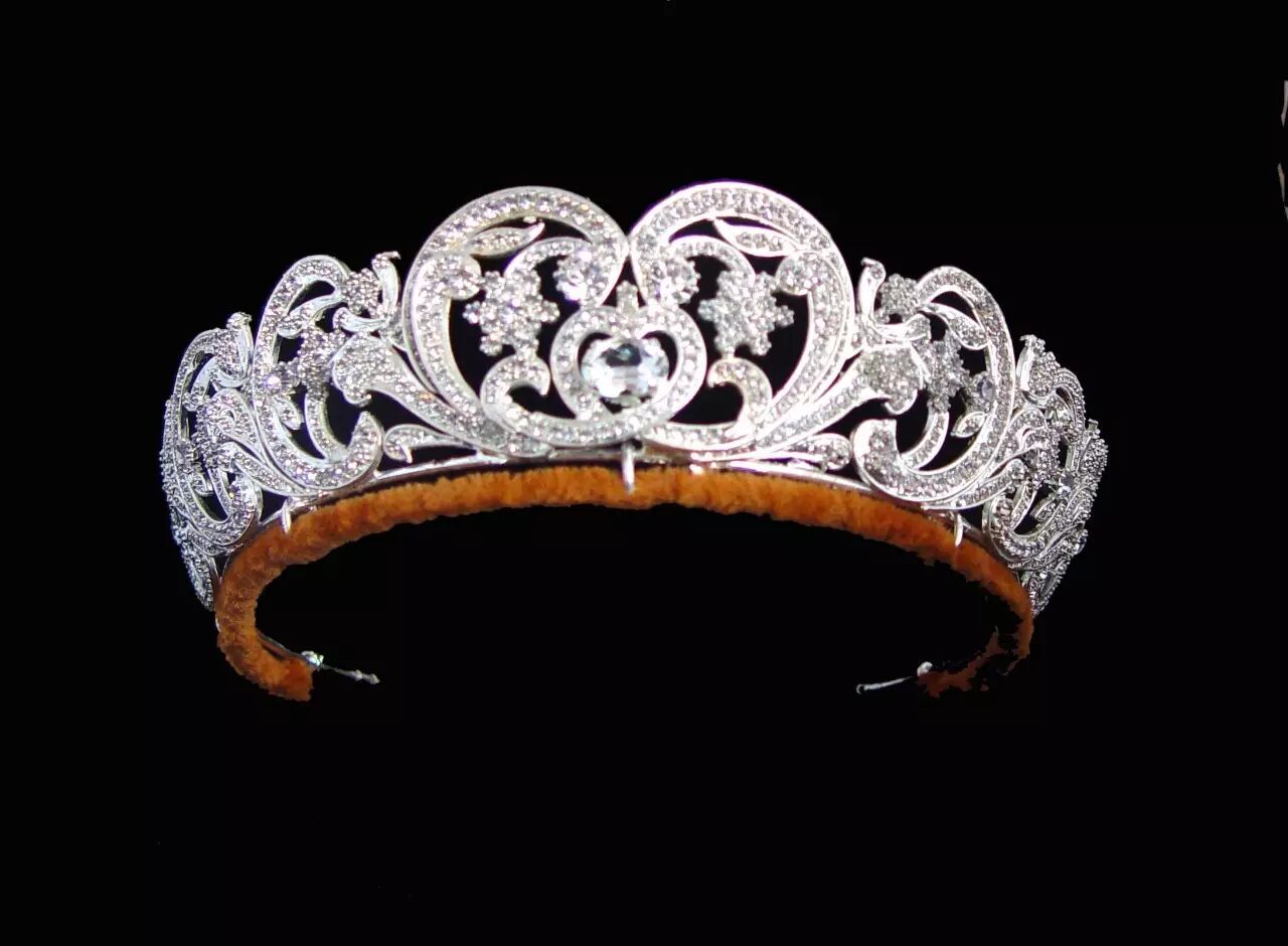 这顶珍珠泪王冠来自伊丽莎白二世女王母亲的家族,具体历史可以追溯到乔治王朝中期,因为镶嵌在冠上的珍珠形状酷似泪滴而得名。冠身以白银打造而成,以珍珠作主要装饰,并可自由拆卸并更换宝石种类,是女王送给戴妃的新婚礼物之一。戴安娜对这顶王冠非常钟情,但是这顶王冠也有如被下过诅咒一样,凡是得到这个王冠的皇室女子,感情世界都经历劫难。