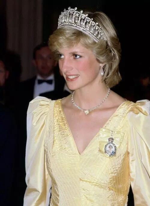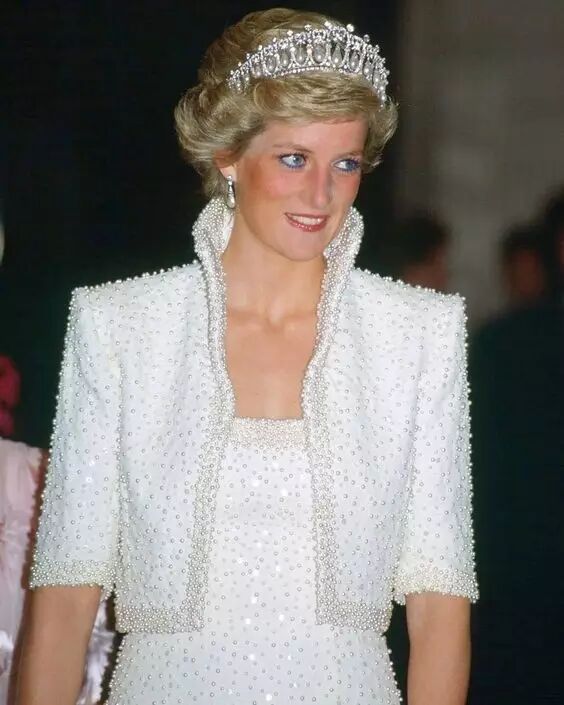戴安娜在1990年11月访问日本,在天皇的宴会上,她头戴珍珠泪皇冠,搭配大颗珍珠耳环,这对耳环也是卡塔尔国王送的婚礼礼物之一。