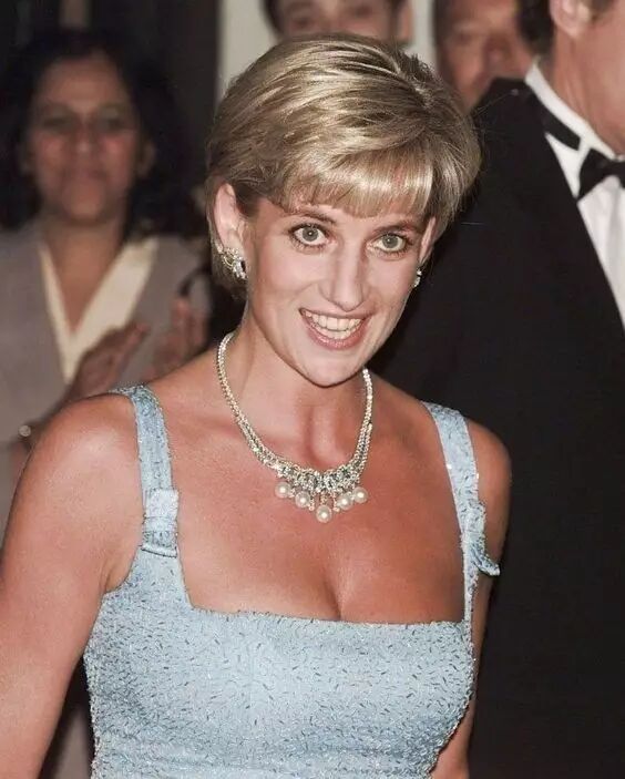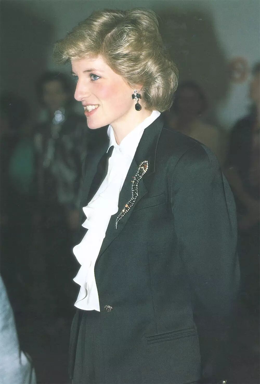 1995年12月11日,戴安娜再次访美,接受联合国授予的人道主义奖,她穿着干练的低胸黑色礼服,搭配之前访问日本时的大颗珍珠耳环,以及一条蛋面蓝宝石与钻石的手链。