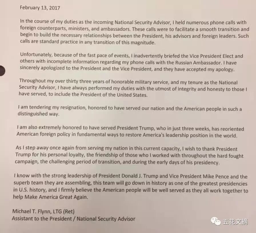 弗林在辞职信中说,因为工作繁忙,他对副总统彭斯汇报时“十分疏忽”,没有向他和其他官员“提供同俄罗斯驻美大使谈话的完整内容”,向川普和彭斯致歉。