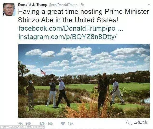 川普和安倍晋三打高尔夫,弗林跟随陪打。