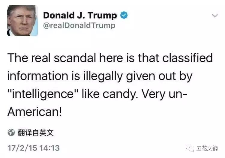 川普发推说,真正的丑闻是情报机构像发糖一样违法泄露机密情报。