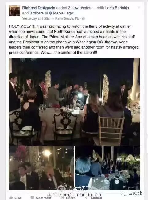 这种混乱的典型例子是:前些天川普安全团队在川总的佛罗里达马阿拉歌庄园,公开讨论如何应对朝鲜发射导弹。川普和班农及团队成员们挤在饭桌前商议,被正在庄园用餐的圈外人德阿加齐奥拍下来放上Facebook。