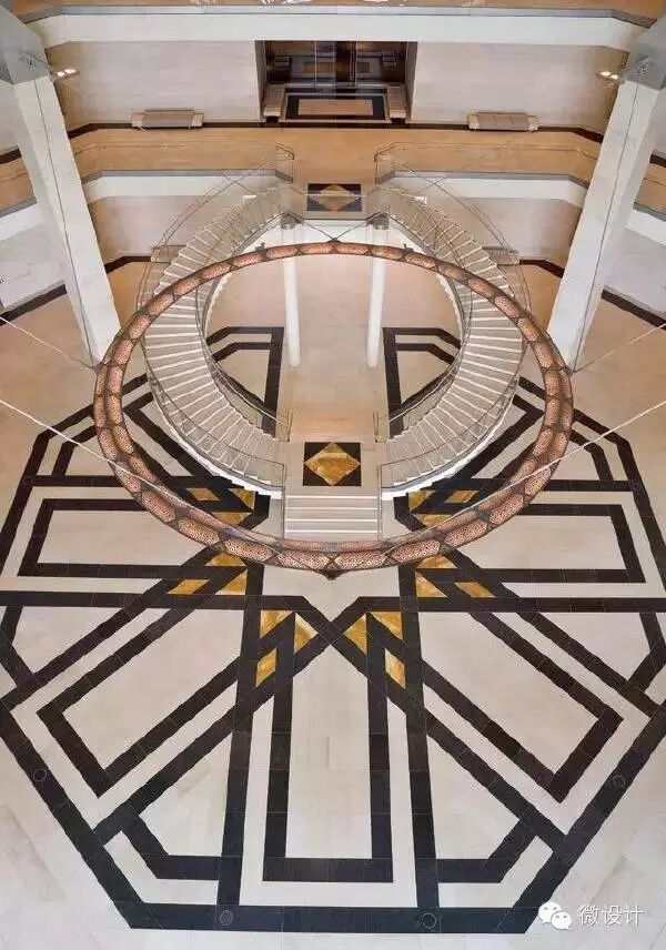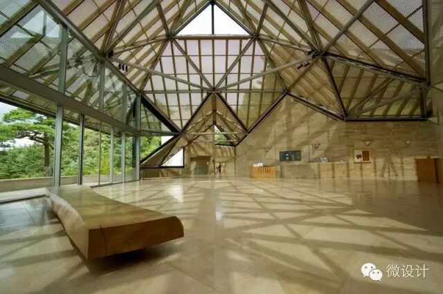 ▲ 一进入室內,便可领会到因美术馆室内环境而产生的戏剧性变化。阳光从屋顶装有百叶窗板的天窗中进入宽敞的大堂当中,照亮了米黄色的大理石墙,带来一种温暖的光芒。