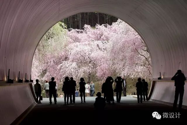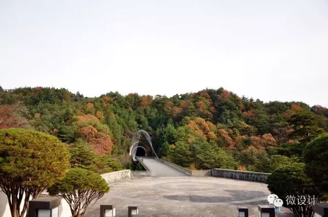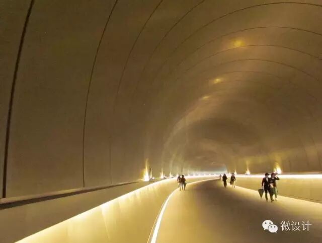 ▲穿越狭长的隧道,即将到达隧道的另外一端时,美术馆的主体建筑便映入眼帘。