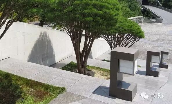 ▲美术馆前台阶的灯柱和造型松,干净清爽。