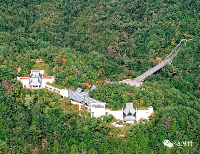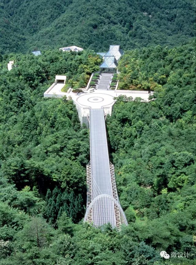 ▲站在美术馆门口回看时光隧道与吊桥,对面的青山将这里团团环绕,只有一个小洞口与外界相连。