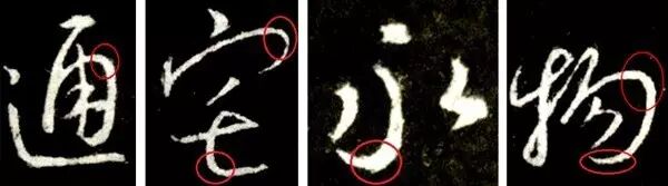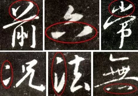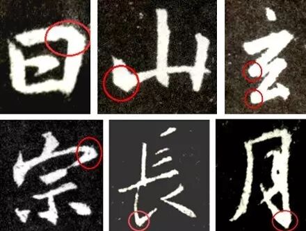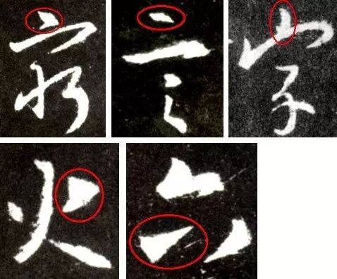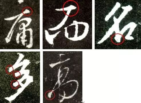 《王圣教》的点表面看起来变化丰富,书写规律难以捉摸。其实可以将点理解为相似笔画的浓缩,缩短主干(去掉行笔过程),强调节点,这样起、折、收的诸多环节全部集中在浓缩的笔画里。这样理解,写点就比较简单了。并且由于行书强调笔画之间的顾盼呼应,所以多数点起笔也有引子(钩起),收笔也带钩,有时带出的钩长超过点本身。