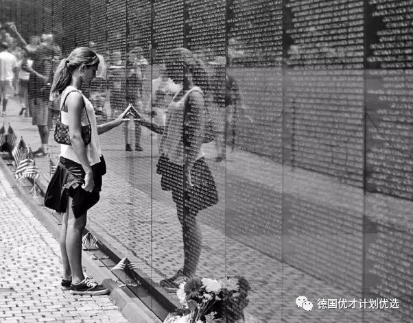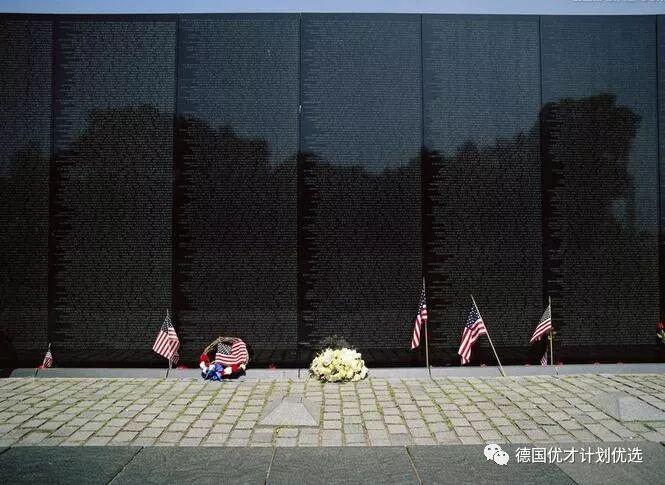这个纪念碑是如此的与众不同。两片光滑的黑色的花岗岩切开地面,仿佛一道大地的伤痕。纪念碑上按时间顺序刻上了为越战献出生命的男男女女,在两片花岗岩的最高点,1959年和1973年(越战开始与结束的年份)“相遇”了,围成了这场战争的时间环。
